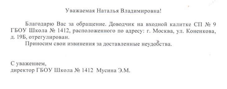 Уважаемая администрация! Я, бабушка одного из учеников 3 "д" класса, возмущена безобразным и несвоевременным заполнением страниц электронного дневника! У нас нет возможности отследить успеваемость мальчика по основным предметам: русскому языку, математике, чтению, окружающему миру. Также в электронном дневнике очень часто отсутвует домашнее задание. По остальным предметам оценки, домашнее задание и тема урока заполняются своевременно. Прошу вас усилить контроль за ведением электронного дневника учителем данного класса. Надеюсь на понимание и дальнейшее сотрудничество. Петрова М.В.
