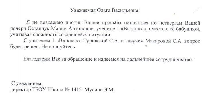 Уважаемая Эльвира Михайловна! Прошу Вас разрешить находиться в здании школы на 1 этаже моей дочери Остапчук Марии Антоновне, ученицы 1 В класса вместе с ее бабушкой Остапчук Л.Е. по четвергам в перерыве между 5 и 7 уроком. Дело в том, что расписание составлено таким образом, что каждый четверг у детей ее класса есть 1 час перерыва между основными уроками и кружком английского языка. Моя дочь не посещает группу присмотра за детьми. После неоднократных просьб оставить ребенка в классе на этот час от классного руководителя, а также от Макаровой С.А. был получен отрицательный ответ. У нашей бабушки, которая забирает ребенка, несколько лет назад случился перелом шейки бедра, ходить домой и снова в школу, а через час снова в школу за ребенком, по скользкой дороге составляет большой труд. Чтобы не ходить домой, от Макаровой С.А. было получено предложение гулять этот час на улице во дворе школы. Однако, в октябре этого года моя дочь переболела острым пиелонефритом. В данный момент она состоит на учете у нефролога. Справка о ее заболевании находится у мед.сестры школы. Поэтому, нахождение на улице в течение часа в зимний период ей категорически запрещен. Если нет такой возможности, как нахождение моей дочери в классе 1 час в неделю, прошу Вас разрешить находиться ей на 1 этаже в холле и ожидать начала английского языка в тепле. С уважением Остапчук Ольга Васильевна.
