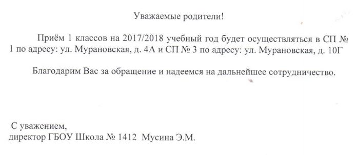 Здравствуйте, Уважаемая администрация школы 1412 с углубленным изучением иностранных языков! Мы группа родителей,детей обучающихся и детей готовящихся обучаться в самой престижной школе района,выражаем свою обеспокоенность поступившей информации о переводе начальных классов в 3 подразделение. Причинами нашей тревоги являются: 1.Большинство детей территоориально прикреплены к 1 СП. 2.Поскольку старшие дети уже обучаются в нашей школе,то такое решение усложнит жизнь многодетных семей. 3.Для детей с повышенным чувством восприятия и тревожностью присущими младшему школьному возрасту с неокрепшей детской психикой, такие перемены крайне не желательны. Надеемся,что при окончательном принятии решения по данному вопросу будет учтено и мнение родителей учеников школы 1412.